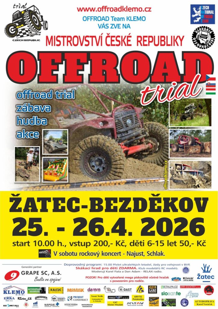 O víkendu 25.-26. dubna 2026 se přijeďte podívat na Mistrovství České republiky v offroad závodech v Bezděkově u Žatce. Příjemně strávený víkend s burácením motorů a zábavou pro malé i velké. Občerstvení zajištěno po celou dobu konání akce.